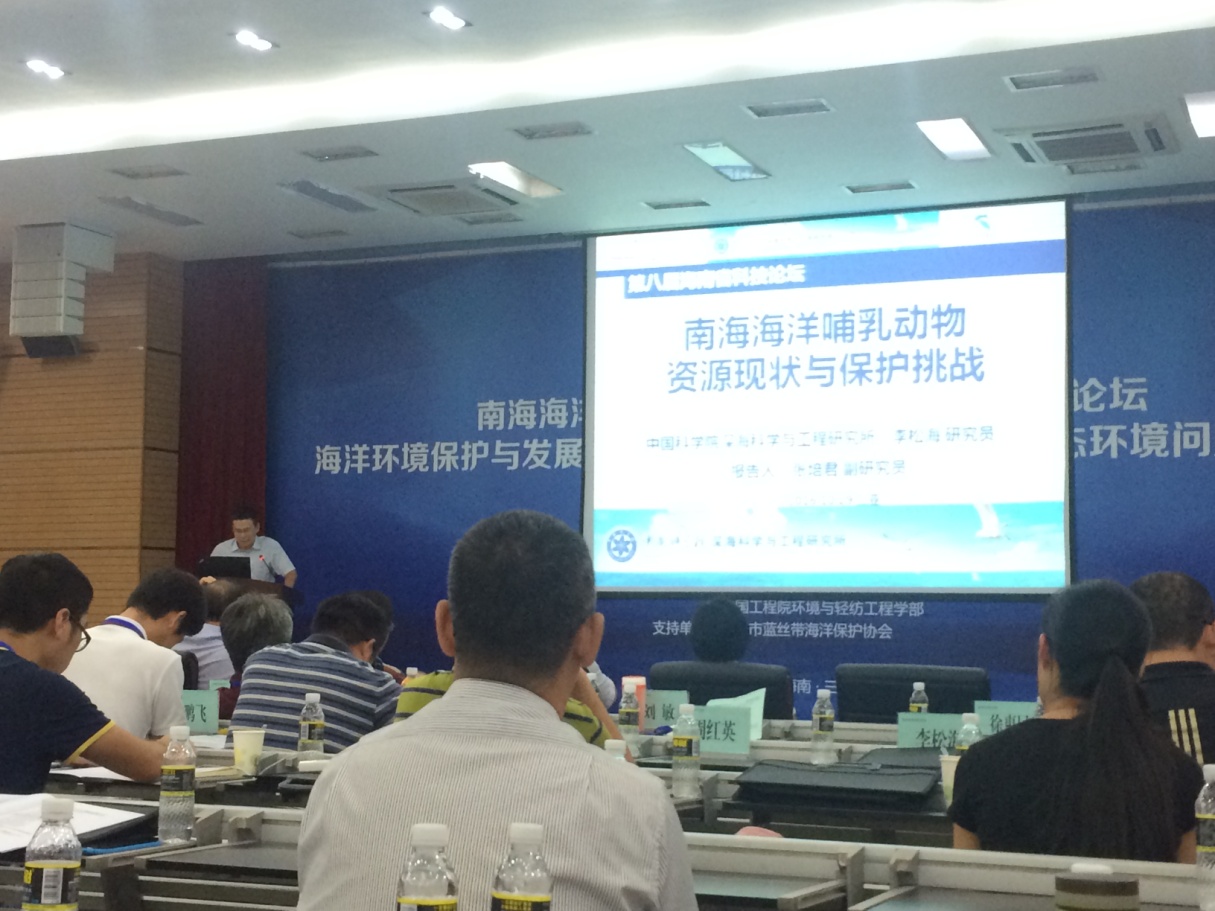 2016年10月29日深海所海洋哺乳动物与海洋生物声学研究组受邀参加南海海洋科技论坛暨第八届海南省科技论坛“海洋环境保护与发展”分论坛。张培君博士参加了本次会议并做了题为“南海海洋哺乳动物资源现状与保护挑战”的报告。此外,海洋哺乳动物与海洋生物声学研究组还协助开展了主题为“保护海洋关注水生野生动物”的科普知识图片展,引起来与会专家以及同学的广泛关注。