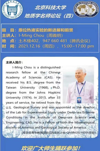 2021年12月16日,中科院深海所深海极端环境模拟研究实验室主任周义明研究员应北京科技大学钟日晨副教授及国际经济地质学家学会北京科技大学学生分会邀请,在线做客“北京科技大学地质学名师论坛”并作题为“原位热液实验的新进展和前景”专题讲座。