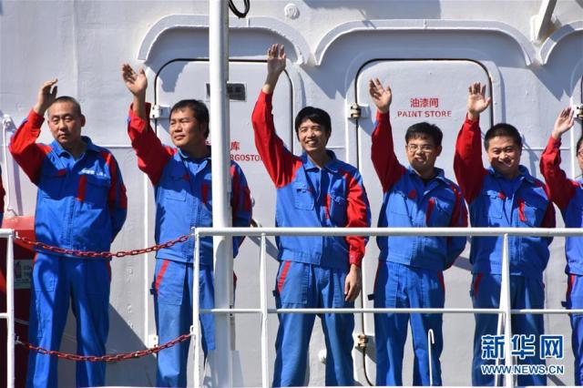 10月16日,参加第三次万米深渊综合科考任务的队员向欢迎人群挥手致意