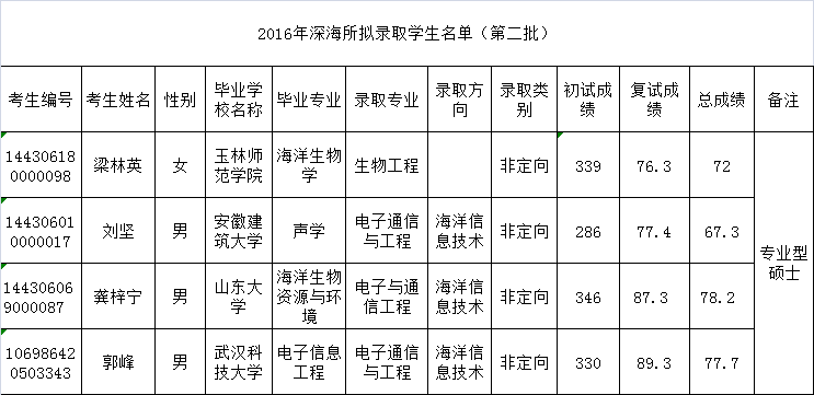 三亚深海所2016年硕士生通过面试拟录取名单公示(第二批)