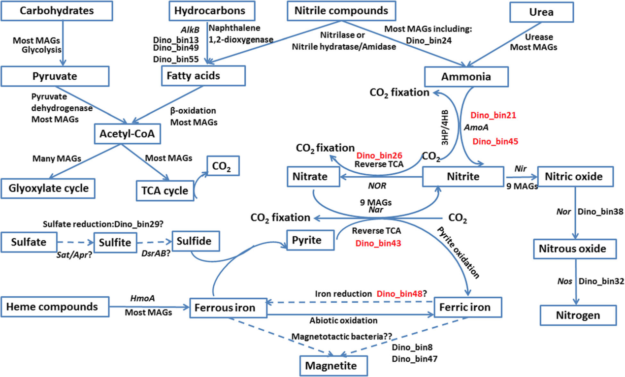 本研究从宏基因数据组装出46个高质量的基因组,分别代表6个细菌门及1个古菌门。基因组的分析和比较结果指出这些基因组大部分都显示是新的纲、目、科、属或种且未曾成功被分离为纯培养。相比包裹骨骼的泥岩样品,骨骼富集了Nitriliruptoria, Deltaproteobacteria and Betaproteobacteria几个纲里的基因组。对基因组功能基因的诠释,揭示了多个物种可能参与碳、氮、硫和铁的代谢。蛋白组学分析发现很多微生物基因已表达,相反,没有发现内源性恐龙胶原蛋白肽。研究表明:出土的恐龙骨骼是微生物(包括新谱系)的栖息地;与外部沉积物相比,骨骼化石内部独特的微生境和地球化学组分支持了较高的微生物生物量,也包含多组基因相互联系的生物地球化学过程;这些微生物群落在中生代恐龙化石中的存在敦促科学家们在寻找残存的内源性生物分子时,必须格外审慎。
