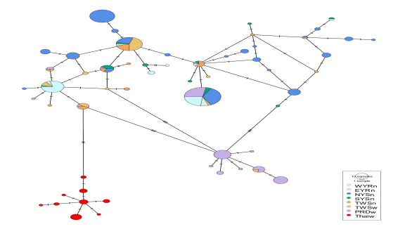 最小间距网状图(minimum spanning network)显示生活在中国水域的江豚大多存在共享单倍型。但来自泰国湾的江豚却形成了独特的单系群,其与南海其它宽脊江豚种群之间的遗传分化水平也高于迄今已知的大多数江豚种群间的分化水平。